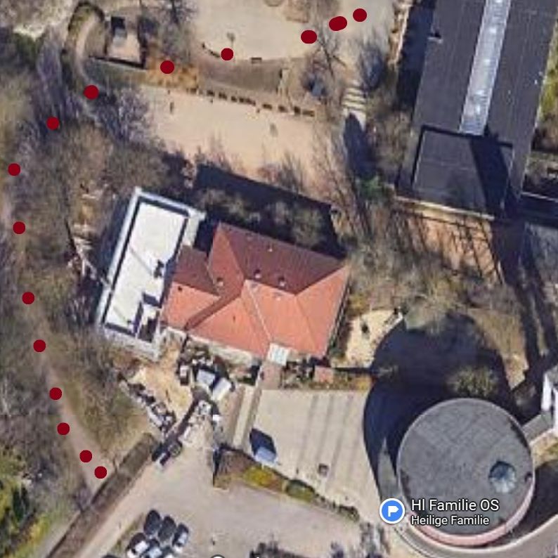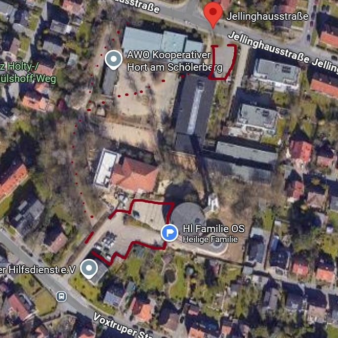 Auto można też zostawić przy równoległej ulicy (Jellinghausstrasse) - a następnie można przejść terenem szkoły i krótką ścieżką prowadzącą na plac kościelny ( ścieżka zaznaczona czerwonymi punktami).