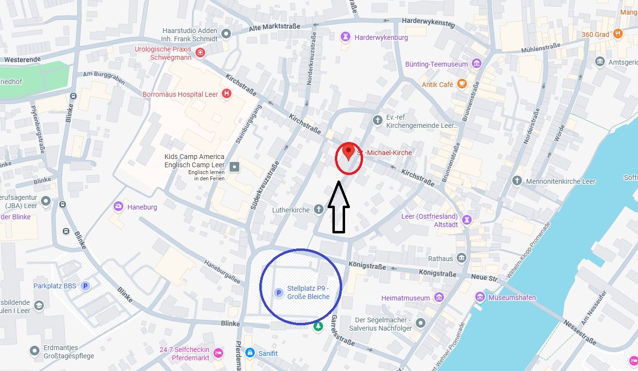 poniżej mapka z kościołem i parkingiem niedaleko St.Michael w Leer